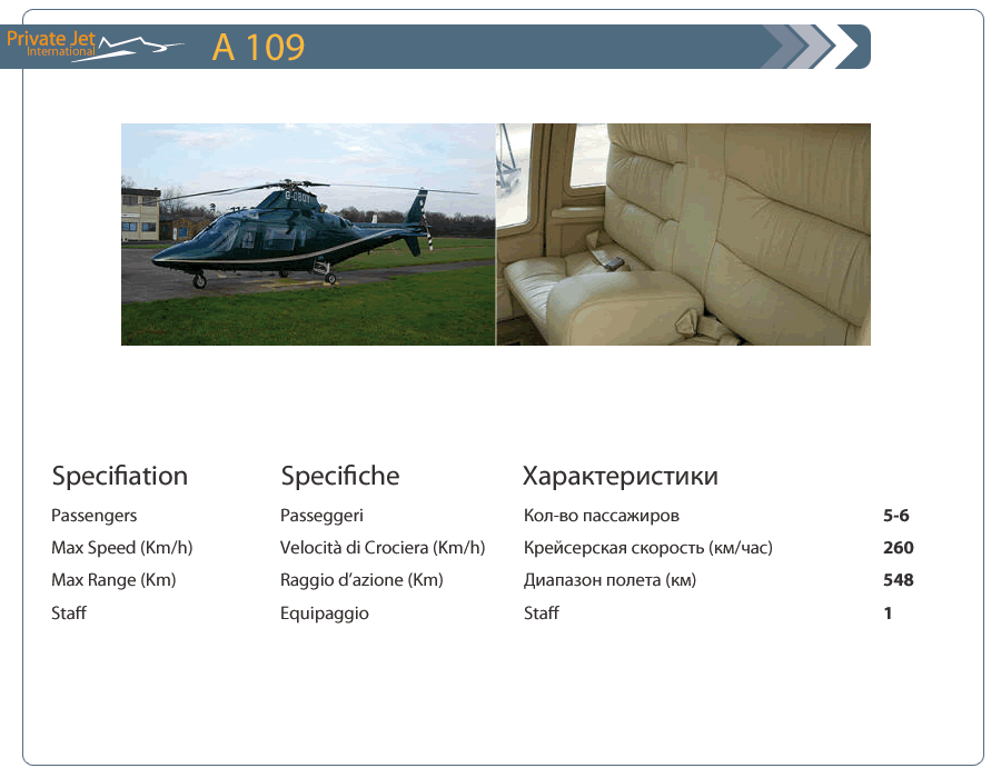 The "Helicopters" can manoeuvre easily in such difficult-to-reach areas, as large congested cities or remote locations. They are ideal for small groups of people for short distance travelling. Nowadays modern charter helicopters are usually powered by a single or two jet engines. Their speed can reach an average of 280 km/h with a range of 100-350 km. The helicopter enables passengers to reach places with no airports and move around the city faster and easier than with a fixed-wing aircraft.